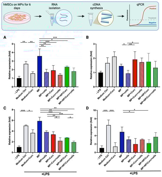 The relative gene expression of pro-inflammatory markers in THP-1 cells in response to LPS stimulation. Differentiated THP-1 cells were treated with LPS (+LPS) in the presence of conditioned medium from MPs (MP), from MPs carrying hMSCs (MP + cells), from MPs loaded with curcumin (MP + Curc), from MPs loaded with curcumin and covered with hMSCs (MP + Curc + cells), from MPs loaded with NPs containing curcumin (MP+/NP/Curc), or from MPs loaded with NP/Curc and covered with hMSCs (MP + NP/Curc + cells) for 24 h. As comparisons, differentiated THP-1 cells were induced by LPS in the presence of medium alone (Medium Ctrl) or medium containing 15 μM curcumin (Medium + Curc). The relative expression of TNFα (A), IL-1β (B), IL-8 (C), or IL-6 (D) in THP-1 cells treated with LPS was normalized to differentiated cells without LPS induction (-LPS) by quantitative PCR. Data shown are mean ± SD (n ≥ 3) * p < 0.05, ** p < 0.01, *** p < 0.005.