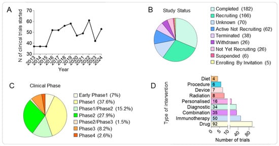 For such analysis, 581 clinical trials were obtained from the filtered database search (Supplementary Table S1). Among the trials with available information about the phase of the study, we observed most of them to be in Phase1 (38%), an initial stage required to assess safety, tolerability and optimal dosage, followed by Phase2 trials (28%) focussed on evaluating the efficacy and to further assess the safety at the optimal dose and Phase1/Phase2 (15%) representing combined trials to streamline early safety and efficacy assessments. Around 10% of the analysed trials are currently in the most advanced study phases (8.2% in Phase3 and 2.6% in Phase4) required to confirm efficacy, monitor side effects, and compare to standard treatments and finally monitor long-term safety and effectiveness; while 7% of the trials are in the Early Phase1 representing exploratory studies with limited human exposure to determine pharmacokinetic (PK) and pharmacodynamics (PD) profiles. Finally, the lower percentage of the analysed study phase is represented by Phase2/Phase3 trials, combined trials to confirm the efficacy and gather more safety data before proceeding to Phase3 (Figure 2C and Supplementary Table S2).