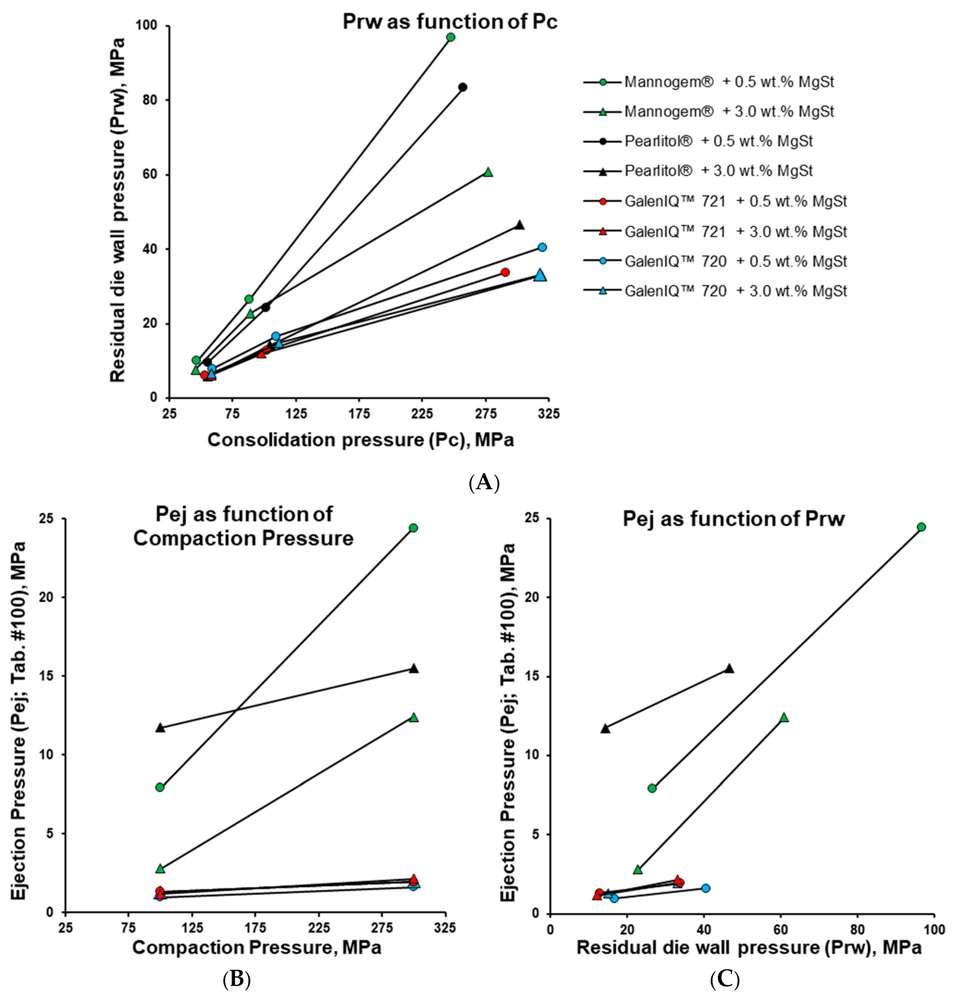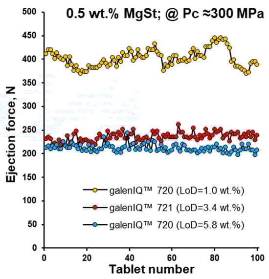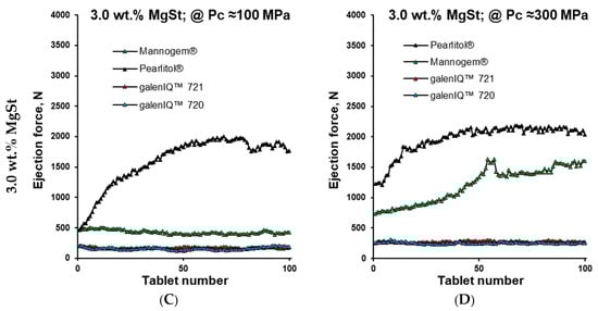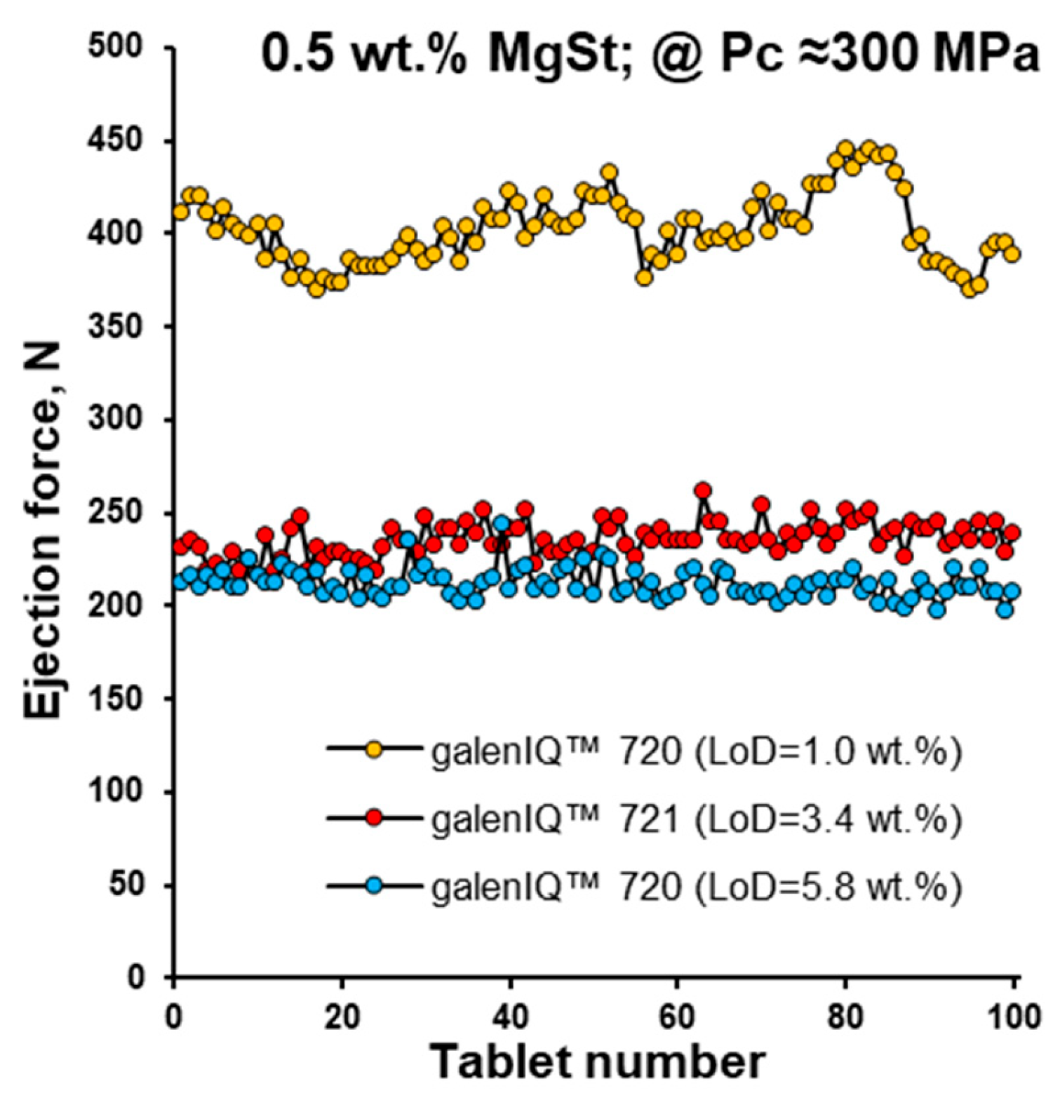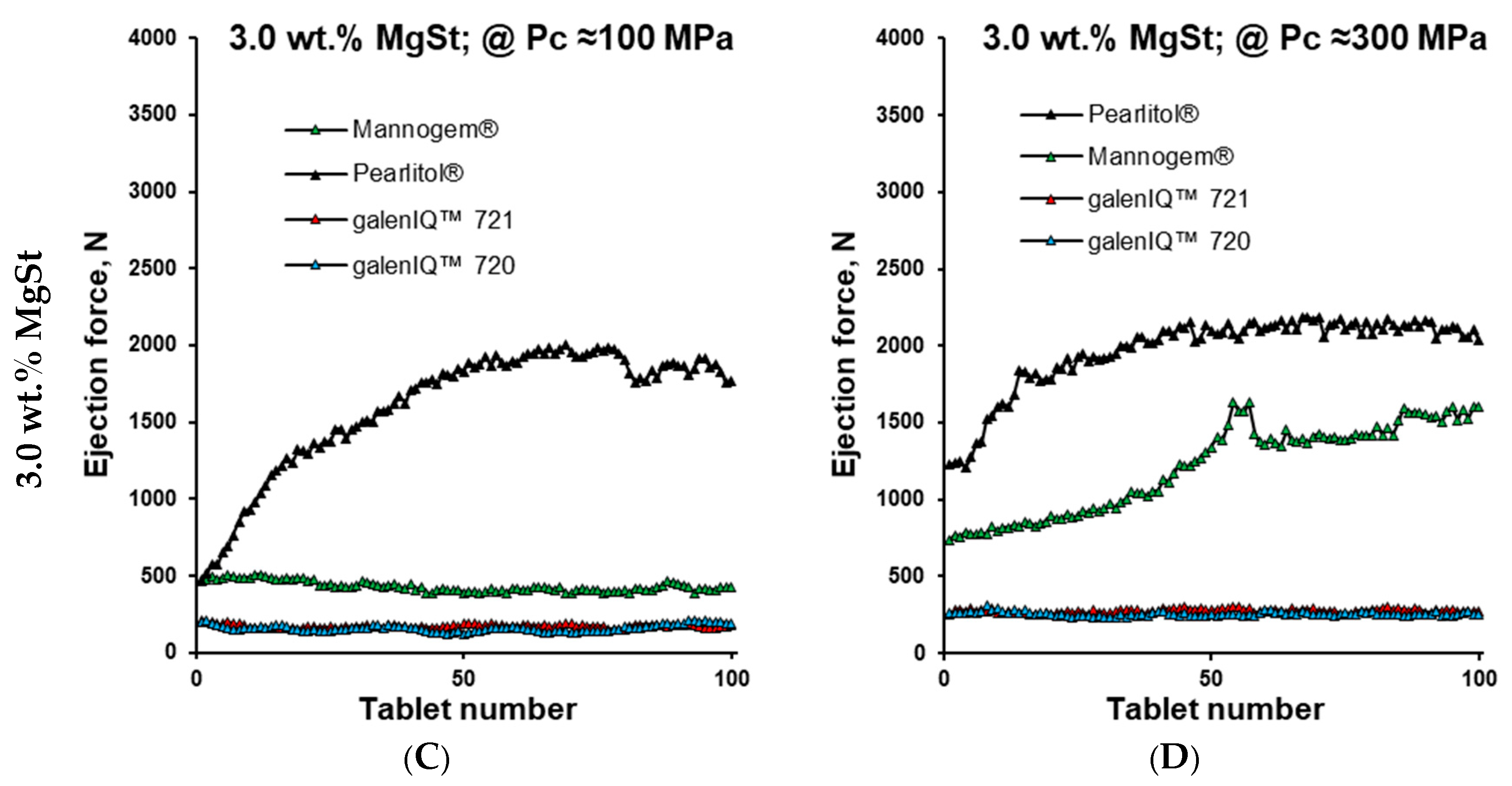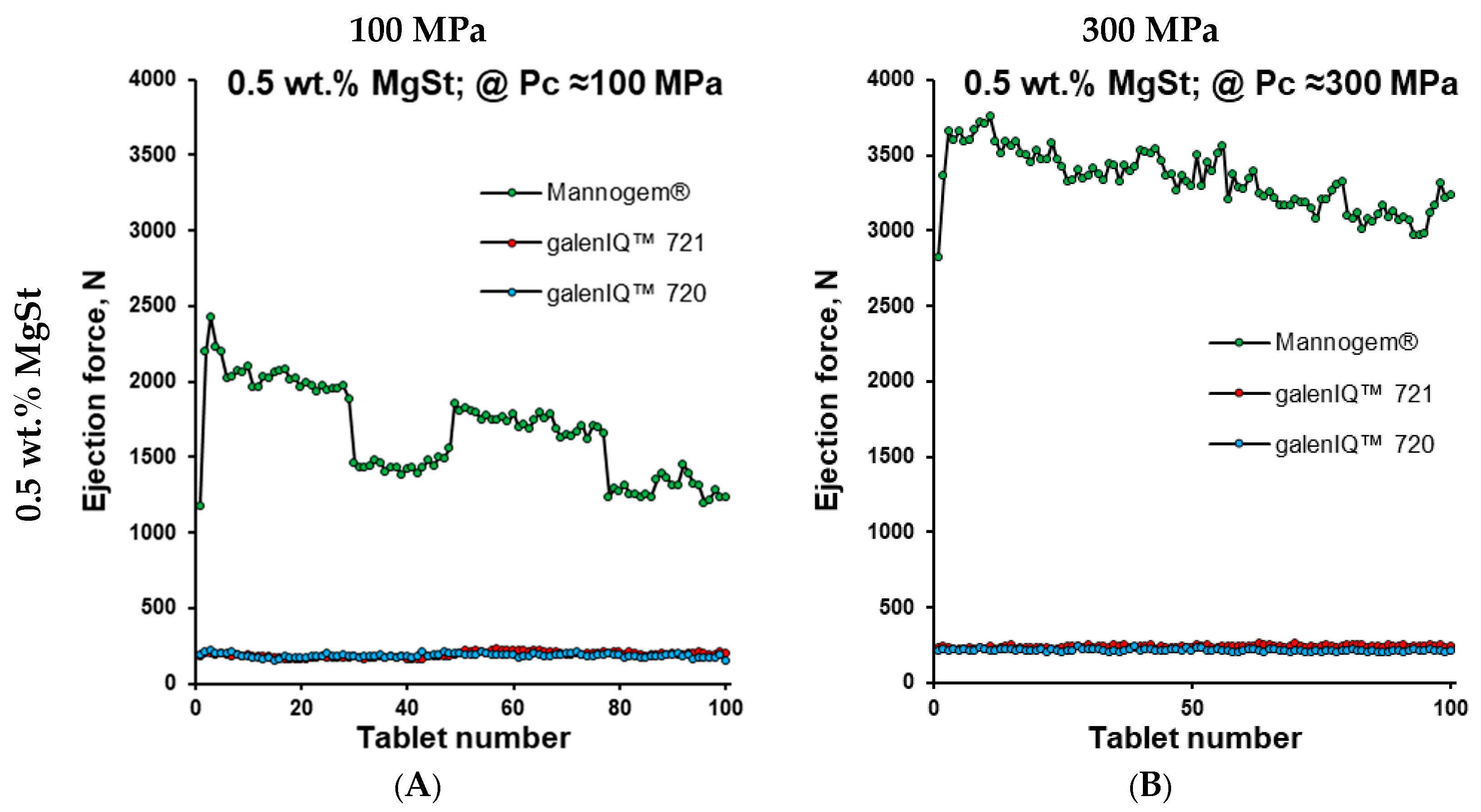 - Takeuchi, H.; Nagira, S.; Aikawa, M.; Yamamoto, H.; Kawashima, Y. Effect of lubrication on the compaction properties of pharmaceutical excipients as measured by die wall pressure. J. Drug Deliv. Sci. Technol. 2005, 15, 177–182. [Google Scholar] [CrossRef]