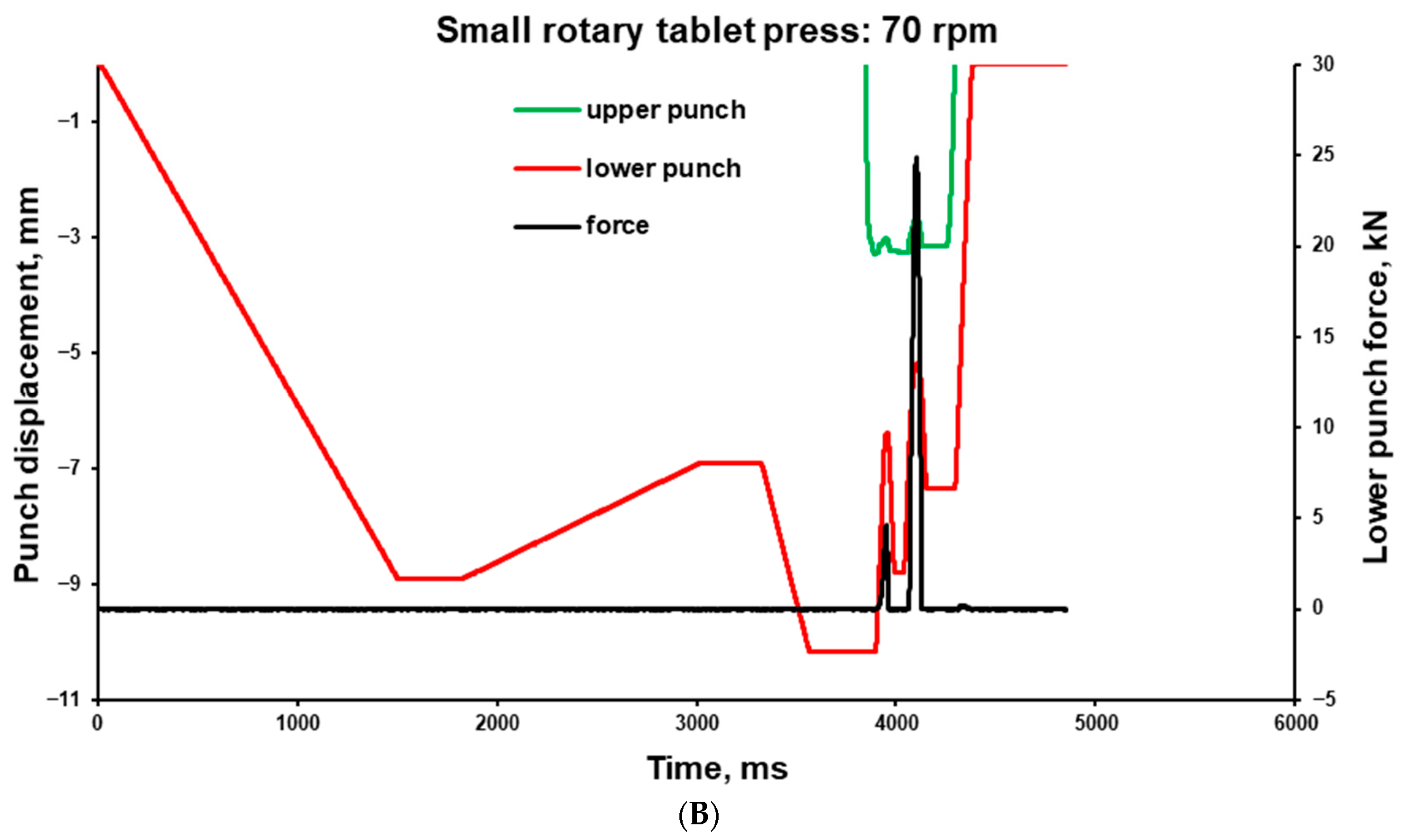 - Mohylyuk, V. Dwell time on tableting: Dwell time according to force versus geometric dwell time. Pharm. Dev. Technol. 2024, 29, 719–726. [Google Scholar] [CrossRef]