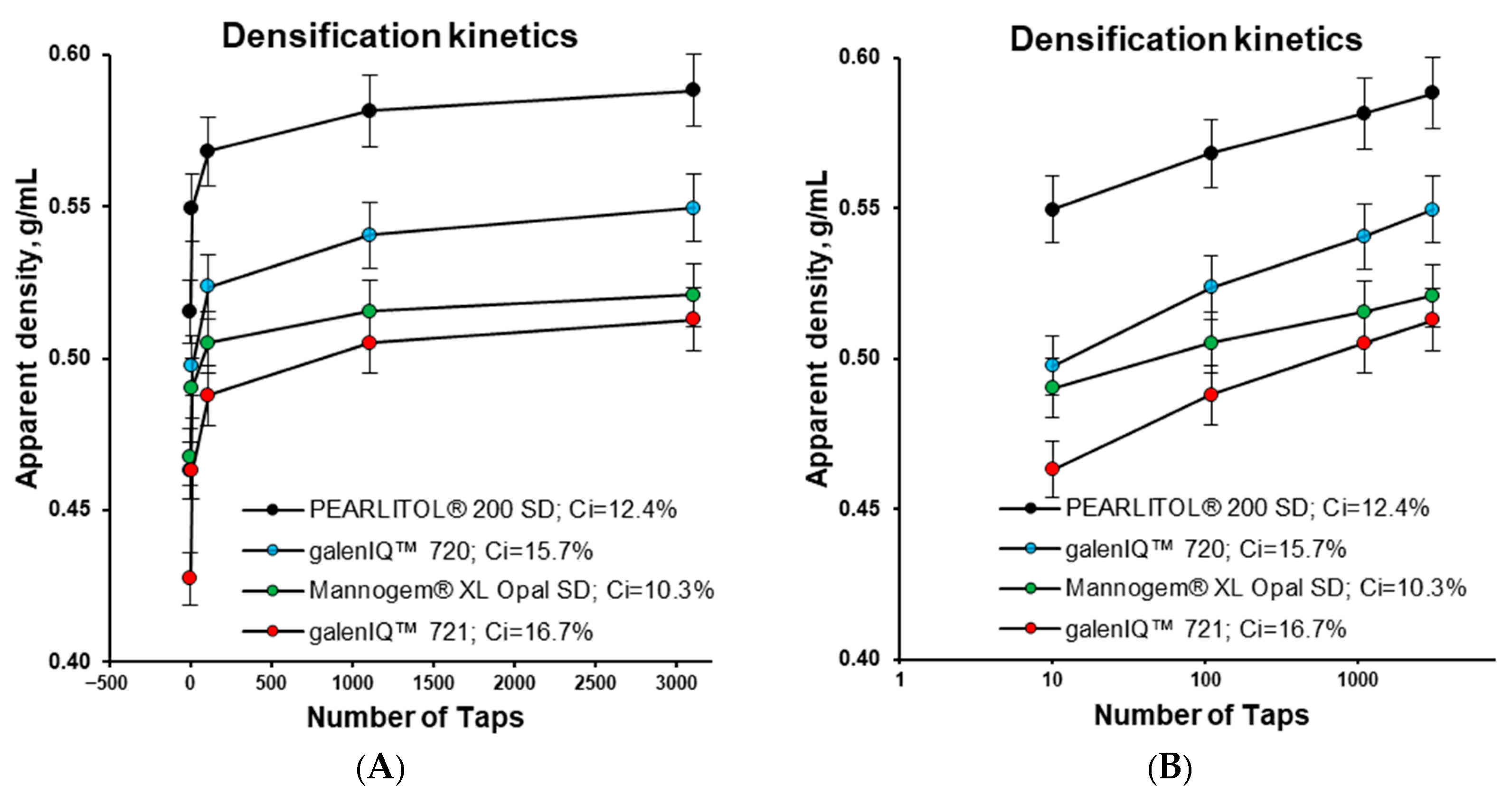 - Paul, S.; Chang, S.Y.; Dun, J.; Sun, W.J.; Wang, K.; Tajarobi, P.; Boissier, C.; Sun, C.C. Comparative analyses of flow and compaction properties of diverse mannitol and lactose grades. Int. J. Pharm. 2018, 546, 39–49. [Google Scholar] [CrossRef]