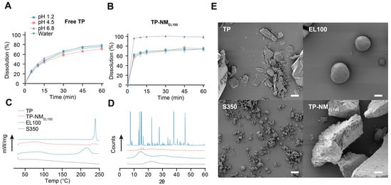 Characterization of TP-NMEL100 and its components. (A,B) Dissolution profiles of free TP (A), and TP-NMEL100 (B) in water and buffer solutions at pH 1.2, 4.5, and 6.8 (Mean ± SD, n = 3). (C–E) DSC thermograms (C), X-ray diffractograms (D) and SEM images (E) of TP, EL100, S350, and TP-NMEL100 (scale bar: 10 μm).