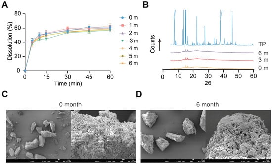 The stability of TP-NMEL100 was evaluated during storage at RT. The dissolution profiles of TP-NMEL100 were monthly measured, and no significant change was observed in the dissolution profiles after 6 months of storage (Figure 3A). Likewise, the X-ray diffractogram (Figure 3B) exhibited no characteristic crystalline peaks of TP, and the SEM images (Figure 3C,D) revealed no notable morphological alterations. These results suggested that TP-NMEL100 maintained its stability in terms of dissolution behavior, crystallinity, and structural morphology after 6 months of storage at RT. According to previous research, the drug loaded into mesoporous silica tended to undergo a transformation from the amorphous to the crystalline state during storage [45]. Our nanomatrix system maintains a remarkable long-term storage stability, which is very important for the clinical translation of TP.