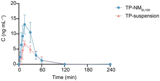 Subsequently, the pharmacokinetic study of TP-NMEL100 was conducted (Figure 4 and Table 1). The plasma concentration reached a peak value of only 7.54 ng/mL post oral administration of free TP, with a Tmax of about 15 min. The Cmax and AUC values of TP-NMEL100 were significantly higher than free TP, reaching 13.91 ng/mL and 412.28 min∙ng/mL, respectively. These values represented an approximate 84% increase in Cmax and a 65.6% increase in AUC compared to free TP, indicating that the loading TP into a nanomatrix markedly enhanced the oral absorption of TP in rats.
