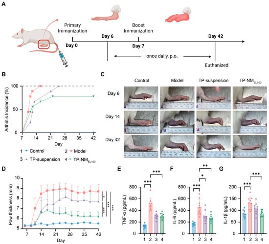 Generally, arthritis symptoms (e.g., increased paw thickness) begin to appear sporadically three days after the booster immunization. This parameter was therefore adopted to evaluate arthritis incidence. Rats in the model group rapidly developed swelling, reaching 100% incidence by day 15. In contrast, both the TP-suspension and TP-NMEL100 groups showed delayed arthritis onset, with some rats in TP-NMEL100 group remaining swelling-free until endpoint (Figure 5B), which indicated excellent anti-arthritis efficacy of TP-NMEL100.