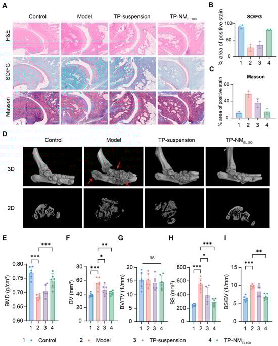 Ankle joints were further analyzed via micro-CT scanning and three-dimensional reconstruction. The results showed that the bone surface of normal rats was complete and smooth. In comparison, the model group exhibited severe bone erosion, which was most effectively mitigated in the TP-NMEL100 group (Figure 7D). This pathological pattern suggested progressive bone erosion with consequent increases in specific surface area due to trabecular perforation and microarchitecture deterioration. Quantitative analyses of bone mineral density (BMD), bone surface area (BS), and the ratio of bone surface area to bone volume (BS/BV) also supported these findings (Figure 7E–I). Compared with the model group, rats in TP-NMEL100 group exhibited a significant increase in BMD (8.3%, p < 0.001) and decrease in both BV (26%, p = 0.0012) and BS (47%, p = 0.0001). Notably, rats in TP-NMEL100 group showed complete preservation of bone parameters, with values remaining comparable to the control group. These mitigation of bone and cartilage damage could be attributed to the more effective suppression of the systemic inflammatory cascade, which was driven by the increased plasma concentrations of TP.