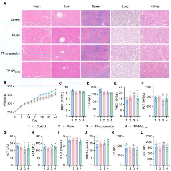Along with the confirmed therapeutic efficacy of TP-NMEL100, it is essential to validate the safety of this approach. Toxicity of TP such as hepatotoxicity and nephrotoxicity in SD rats had been reported in previous study [6,48,49]. Subsequently, a comprehensive safety evaluation of these rats after treatment was conducted (Figure 8).
