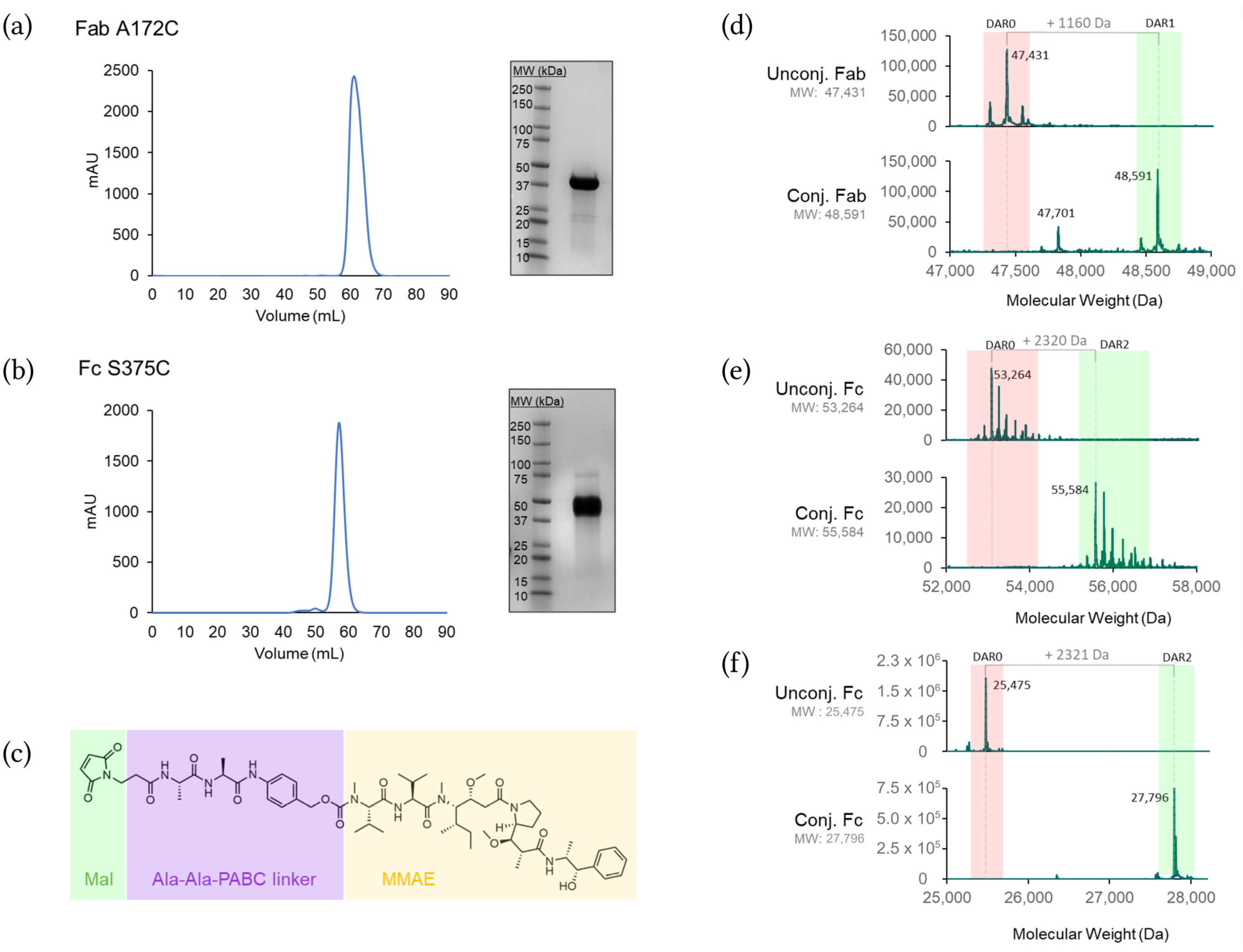 3.2. Selected Cysteine Mutants in Trastuzumab Fragments Are Homogenously Pure and Monodisperse Post Conjugation