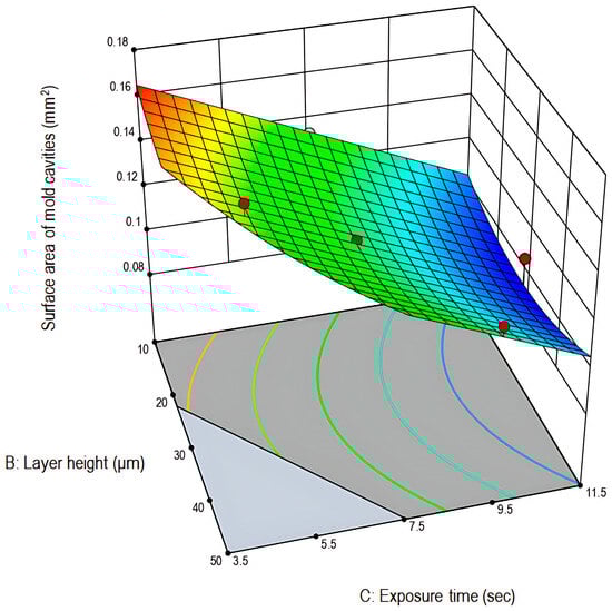 The FCCD was performed to characterize the design space and identify the optimum 3D printing working parameters. Overall, seventeen (17) experiments were performed. The results of the experimental design for the two responses studied, i.e., the surface area of the mold cavities and the microneedle height, are presented in Table 6.