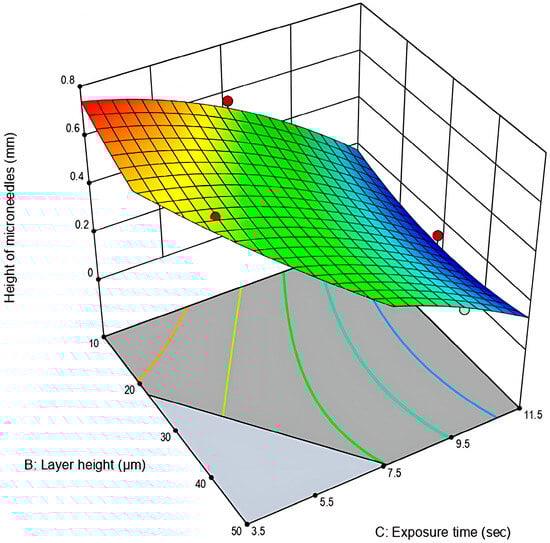 Following this, a risk-assessment analysis was carried out to identify the potential factors affecting 3D printing accuracy. From this preliminary evaluation and after searching the literature [15,16], printing speed, layer height, and exposure time were identified as potential critical process parameters (CPPs). To optimize these variables, a Face-Centered Central Composite Design (FCCD) with α = 1 was carried out. The factor levels were defined, taking into account the working range of the 3D printer, while focusing on achieving fine detail parts, due to the small size of the microneedles. Additionally, a design constraint was introduced between the factors (B) and (C), given that thicker layers require correspondingly longer exposure times. The constraint equation was extracted based on the worst-case scenario under which the maximum layer height 50 μm required a minimum of 7.5 s exposure to light to allow for curing. This approach ensured that, under all experimental combinations, polymerization of the resin layers takes place. The parameters of the optimization design are summarized in Table 1.