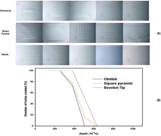 (A) Microscopic images of individual Parafilm®M layers for each of the three designs and (B) a graphical representation of the percentage of number of holes created in relation to the penetration depth (μm) and the number of Parafilm®M layers.