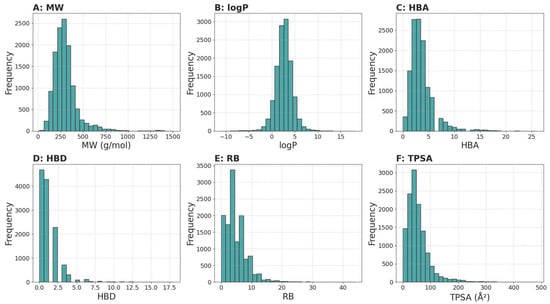 Distribution of physicochemical property values for compounds in the dataset. (A) Molecular weight (MW, g/mol); (B) Octanol–water partition coefficient (logP, dimensionless); (C) Number of hydrogen bond acceptors (HBA, count); (D) Number of hydrogen bond donors (HBD, count); (E) Number of rotatable bonds (RB, count); (F) Topological polar surface area (TPSA, Å2). Each panel shows the histogram of the corresponding property for all molecules in the dataset.