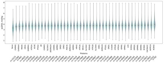 This study utilizes a panel of proteins proposed by pharmaceutical companies to reduce the risks of acute toxic reactions during drug discovery [26]. However, the relationship of these proteins with in rodents has not been previously discussed. Moreover, it is clear that the relevance of these targets to this endpoint may vary. To assess this, we created ligand subsets for each protein using a docking score threshold of −7 kcal/mol. It is assumed that a molecule with a docking score lower than this threshold indicates strong binding with the protein [41,42]. For each subset, boxplots of the (mol/kg) distributions were constructed. The results are presented in Figure 5. Ligands that do not bind to any protein showed the lowest values, i.e., were the least toxic compared to other subsets. This may serve as supporting evidence for the hypothesis that lack of binding to antitargets correlates with low toxicity, except for nonspecific toxicants.