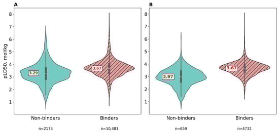 Violin plot distributions of (mol/kg) values between non-binders (cyan) and binders (pink, hatched) in (A) the raw dataset (12,654 compounds) and (B) the filtered dataset (5391 compounds) after application of the NIH and Brenk molecular filters. Binders are defined as compounds with at least one docking score below −7 kcal/mol for any protein target. Median values are annotated in red. Violin plots illustrate the data distribution by combining a box plot (showing quartiles and median) with a kernel density estimation (where wider sections indicate higher data density, revealing the probability density of values). The embedded box plot shows the median as the central line, the first and third quartiles as the box boundaries (encompassing the interquartile range), whiskers extending to the furthest points within 1.5 times the interquartile range. The sample sizes for each group are indicated below each violin plot.