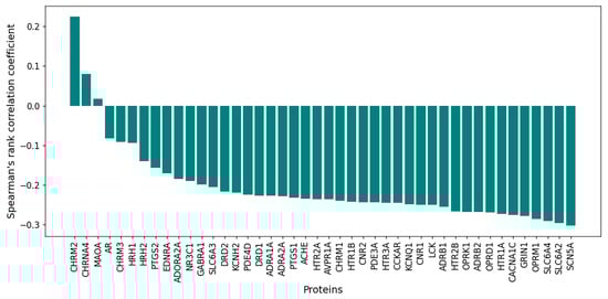 For each of the 44 proteins, the Spearman correlation coefficient was calculated based on all 12,654 ligands. According to our hypothesis, increased affinity for the proteins (i.e., lower docking scores) leads to greater toxicity, expressed as higher values. In other words, an inverse relationship between docking score and is expected, corresponding to negative correlation coefficients. The values ranged from 0.2 to −0.3, with a median of −0.14 (Figure 9), indicating that there is almost no association between affinity and in the raw data. However, this result is expected for at least three reasons. Firstly, some molecules do not bind to the proteins and thereby introduce noise into the analysis; as previously discussed, a molecule may be toxic due to activity on other proteins or for other reasons. Secondly, docking scores below the binding threshold also contribute noise. Thirdly, comparing docking scores for molecules from different regions of chemical space can distort the results. It is therefore more appropriate to analyze chemical clusters separately.