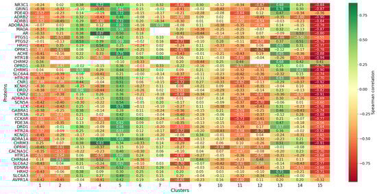 For the reasons mentioned above, it was of particular interest to analyze the correlations between (mol/kg) and docking scores across different chemical clusters. To this end, Butina clustering was employed. The 15 largest clusters were selected for further analysis, with cluster sizes ranging from 13 to 34 molecules. The chemical structures of these compounds are provided in Supplementary Materials Figures S1–S15. For each of the remaining clusters, 44 Spearman correlation coefficients were calculated (Figure 10). If all compounds in a cluster had a docking score of zero for a particular protein, the corresponding entry in the heatmap is marked as missing. As shown in Figure 10 the correlations vary markedly depending on the cluster. This indicates that raw data indeed require additional post-processing.