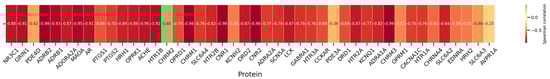 Particular attention is drawn to cluster 15 due to the presence of strong negative correlations across almost the entire protein panel. Although such values are consistent with our hypothesis, the presence of correlations with so many proteins is suspicious. Typically, toxicants have one or a few specific target proteins. This cluster contains aliphatic carboxylic acids with unbranched chains (Figure S15). These compounds show a high correlation between logP and (Spearman correlation coefficient = 0.92). In this case, it is reasonable to expect that the docking scores contain a hidden variable—logP. To test this hypothesis, we calculated correlations between the logP values of the acid molecules and their affinities for each protein (Figure 11). The results reveal a clear dependence to varying degrees across each protein, indicating an obvious influence of chemical structure homology on the overall docking score. Despite its simplicity, this finding is important for interpretation. Sometimes in the literature, correlations between protein affinity and or other toxicity endpoints are reported [57]. However, using the example of aliphatic carboxylic acids, we have shown that the presence of such correlations alone does not justify conclusions about the toxicant’s mechanism of action.