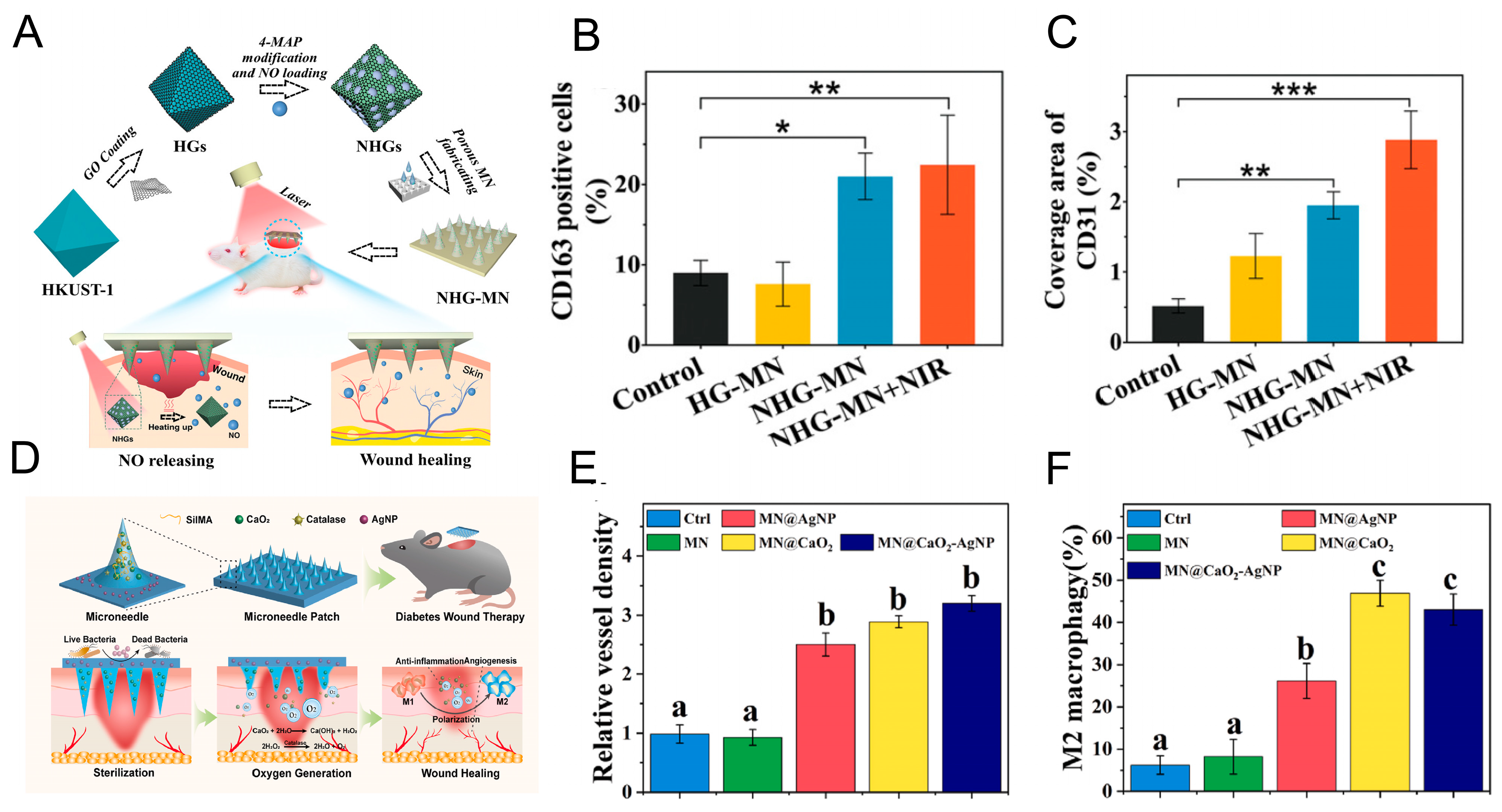 - Jin, Y.; Liu, S.; Wang, X.; Wang, C.; Ruan, Q.; Li, W. Multifunctional microneedle patches loaded with engineered nitric oxide-releasing nanocarriers for targeted and synergistic chronic wound therapy. Adv. Mater. 2025, 37, 2413108. [Google Scholar] [CrossRef]