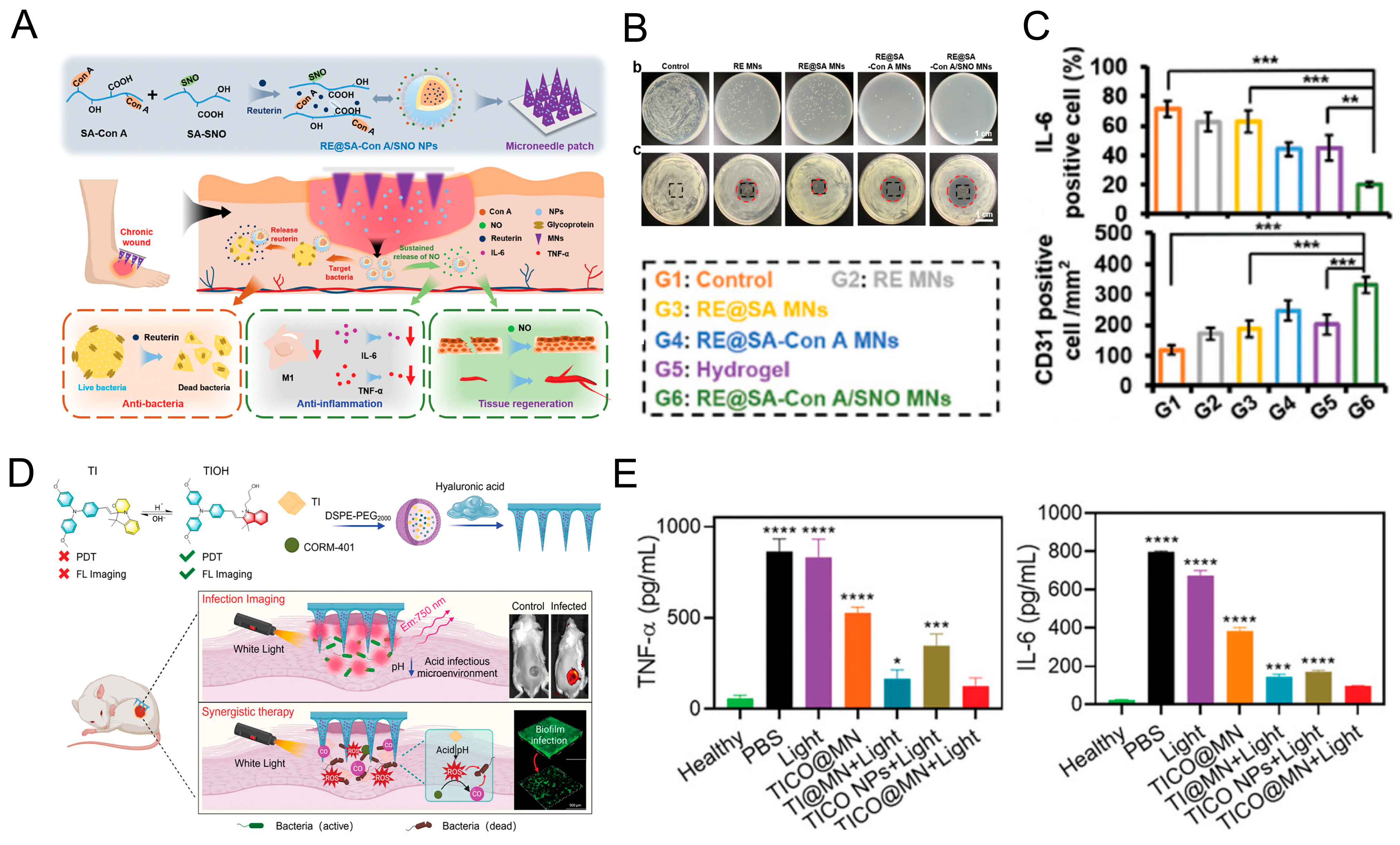 | NO | Dissolving MNs | RE@SA-ConA/SNO | Wound infection | [132] | |