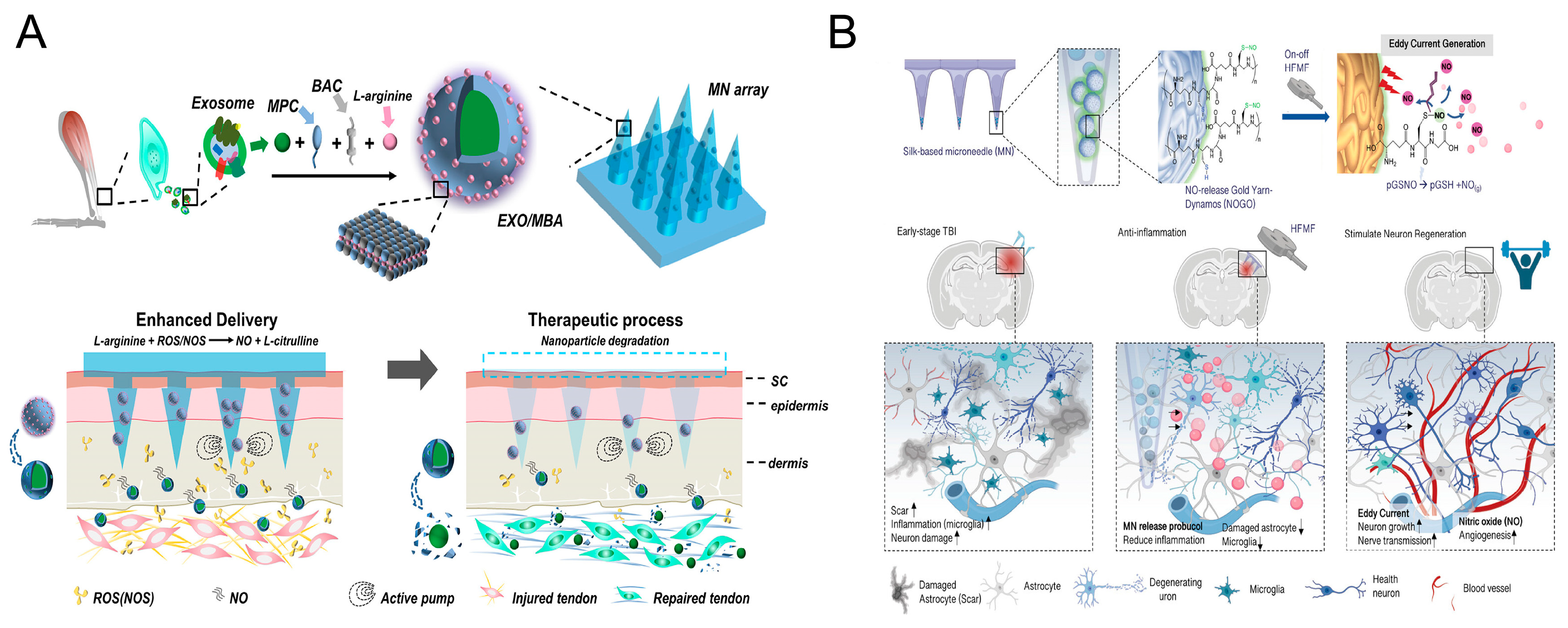 - Liu, A.; Wang, Q.; Zhao, Z.; Wu, R.; Wang, M.; Li, J.; Sun, K.; Sun, Z.; Lv, Z.; Xu, J.; et al. Nitric oxide nanomotor driving exosomes-loaded microneedles for achilles tendinopathy healing. ACS Nano 2021, 15, 13339–13350. [Google Scholar] [CrossRef] [PubMed]
