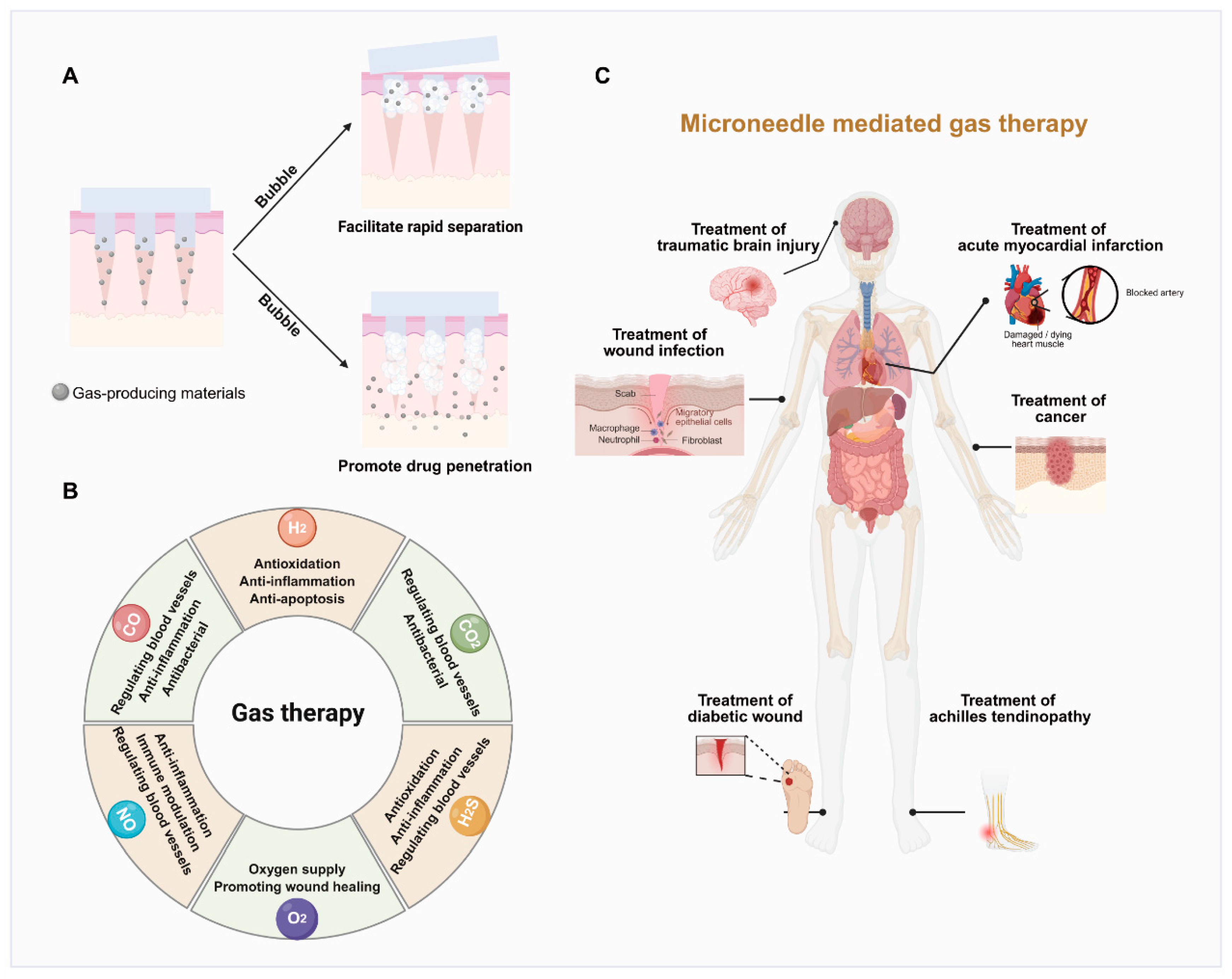 Zheng, Z.; Zhou, T.; Li, H.; Zeng, J.J.X.L.; Fu, Y.; Lu, C.; Peng, T.; Wu, C.; Quan, G. Microneedle Mediated Gas Delivery for Rapid Separation, Enhanced Drug Penetration, and Combined Therapy. Pharmaceutics 2025, 17, 1576. https://doi.org/10.3390/pharmaceutics17121576