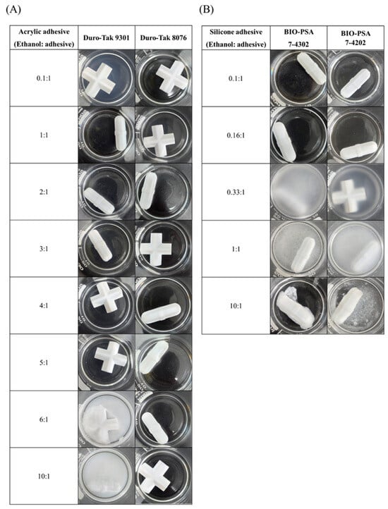 Solvent ratio screening of pressure-sensitive adhesives with ethanol: (A) acrylic-based adhesives (Duro-Tak® 9301 and Duro-Tak® 8076) and (B) silicone-based adhesives (BIO-PSA™ 7-4302 and BIO-PSA™ 7-4202).