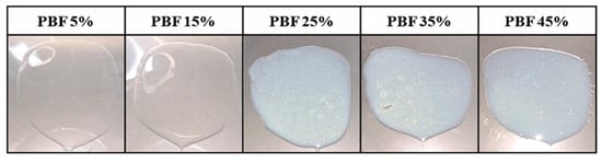 Further investigations were conducted to determine the appropriate drug content. PBF was dissolved in ethanol at a concentration of 120 mg/mL and incorporated into the acrylic-based adhesive Duro-Tak® 8076 at solid mass ratios of 5, 15, 25, 35, and 45% (w/w). The mixtures were cast and dried to obtain the solid films, as shown in Figure 3. The films containing 25% or more exhibited opacity and visible crystallization upon drying, whereas those containing up to 15% remained clear and homogeneous. The crystallization and opacity observed at loading rates above 25% indicated that the adhesive matrix could not maintain PBF in an amorphous, molecularly dispersed state at higher concentrations. In contrast, patches containing less than 15% of the drug remained transparent, suggesting a uniform distribution and physical stability. Accordingly, a drug loading of 15% was considered optimal, balancing sufficient drug incorporation with the need to prevent phase separation and crystallization, which would compromise formulation performance and reproducibility [35].