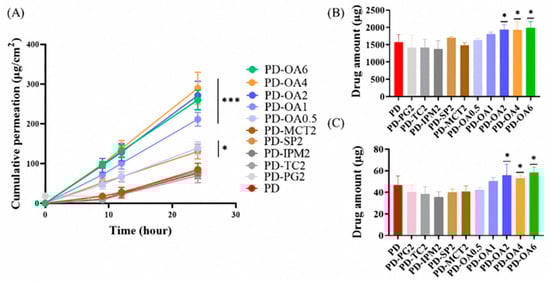 In vitro skin permeation study of PBF patches with permeation enhancer using Franz diffusion cells: (A) cumulative permeation profile over 24 h, (B) drug amount retained in the stratum corneum after 24 h, and (C) drug amount retained in the dermis after 24 h. (n = 3) * p < 0.05, *** p < 0.001 compared with PD.