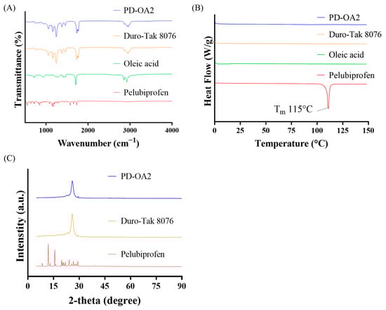 Physicochemical properties of the PD-OA2 patch: (A) FTIR spectra, (B) DSC thermograms, and (C) XRD patterns.