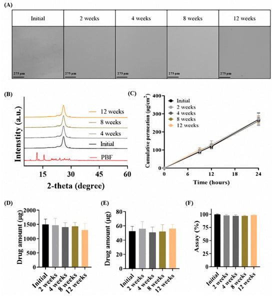 Accelerated stability evaluation of the PD-OA2 patch (40 °C/75% RH, 3 months): (A) optical microscopy, (B) XRD patterns, (C) cumulative permeation profile over 24 h, (D) drug amount retained in the stratum corneum after 24 h, (E) drug amount retained in the dermis after 24 h and (F) assay of patch (n = 3).
