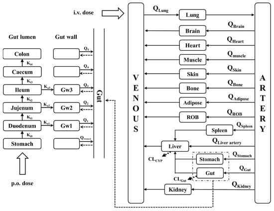 We developed a whole-body PBPK model consisting of intestinal, gut wall, lung, heart, spleen, liver, kidney, brain, adipose, muscle, skin, stomach, arterial blood, venous blood, and the rest of the body (ROB), which are connected by the blood circulatory system (Figure 2).