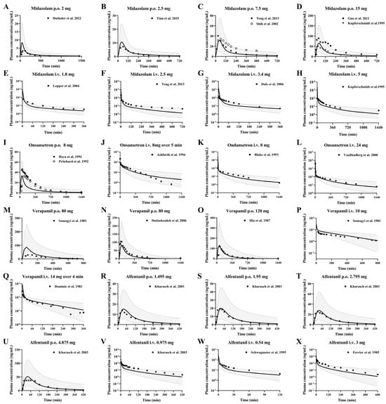 The drug unbound fraction for patients with liver cirrhosis (fu,cirrhosis) are estimated based on a previously published approach [21]. Among these six drugs, except for verapamil and alfentanil, which primarily binds to α1-acid glycoprotein [22,23], the other drugs primarily bind to albumin [24,25,26,27]. According to the pKa values of the drug it was assumed that it binds to either α1-acid glycoprotein or albumin, and the calculation was carried out via Equation (1).