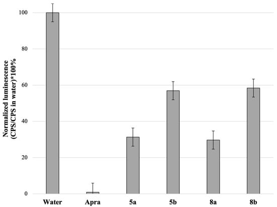Inhibition of protein synthesis in vitro in the presence of new apramycin derivatives (5a, 5b, and 8a, 8b), apramycin, and water (as a control). All compounds were tested at a final concentration of 0.4 μM. The relative maximum accumulation rates of firefly luciferase (Fluc) are shown. The errors correspond to the standard deviation (n = 3).