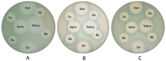 Apramycin and its new derivatives (5a,b, and 8a,b) increase the misreading of codon 537 of the β-galactosidase reporter gene in E. coli. Figure (A) shows the construct with the native codon GAA. Figures (B,C) show the replacement with GGG and GAC, respectively. The test results are shown for compounds 5a,b, 8a,b, as well as for streptomycin (Str), tobramycin (Tobra), kanamycin A (Kan), and apramycin (Apra). The concentration of all antibiotics is 50 mg/mL. The volume of each antibiotic is 0.1 μL.