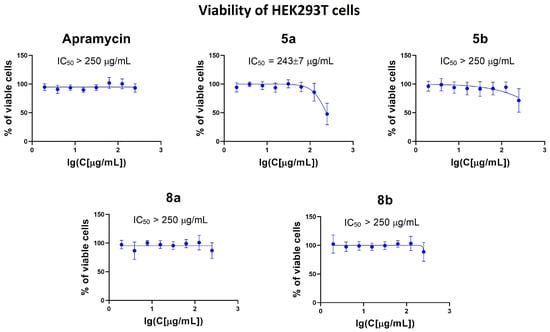 The MTT test [20] was performed in order to evaluate the effect of the compounds on eukaryotic cells’ survivability. Compounds 5a,b, 8a,b, and apramycin, as the reference drug, were tested on HEK293T human embryonic kidney cell line (ATCC). Compounds 5a,b, 8a,b, and apramycin were prepared as water solutions with a 50 mg/mL concentration. The HEK293T cell line was cultivated in DMEM/F-12 medium (Paneco LLC, Moscow, Russia) containing 10% FBS, 50 µg/mL penicillin, and 50 µg/mL streptomycin (Thermo Fisher Scientific, USA) at 37 °C in 5% CO2. Triplicates on 96-well plates were used, and 2500 HEK293T cells were seeded in 140 µL of DMEM/F-12 medium in each well during day one. The next day, compounds in twofold successive dilutions were added to these plates (concentrations in wells ranged between 2 and 250 µg/mL for 5a, 5b, and 8a, 8b). Plates were incubated for 72 h at 37 °C in 5% CO2. Afterwards, 0.5 mg/mL of the MTT reagent (Paneco LLC, Moscow, Russia) was added to each well. After 2 h of incubation, the media with MTT was replaced with 140 µL of DMSO, and all plates were placed on a shaker for 10 min for formazan to dissolve. Finally, the absorbance at a 555 nm wavelength was measured on all plates via the plate reader Victor X5 (PerkinElmer, Waltham, MA, USA). The data were then normalized, and dose–response curves and IC50 were calculated by means of GraphPad Prism version 8.0.2. (GraphPad Software, Inc., San Diego, CA, USA).