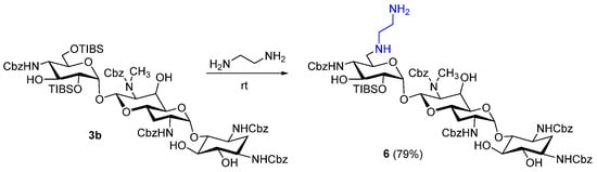Next, we evaluated the possibility of double modification by nucleophilic substitution of two sulfonyloxy groups in 3b with the above-mentioned diamines. Several attempts to replace both 2″,6″-TIBSO groups in derivative 3b with ethylenediamine were made. Treatment of 3b with ethylenediamine at room temperature for 24 h, accompanied by substitution of the primary 6″-TIBSO fragment, led to the derivative 6 with a good yield of 79% (Scheme 3). An increase in the reaction temperature up to 100 °C resulted in slow degradation of the antibiotic core of 6, while replacement of the secondary and more sterically hindered 2″-TIBSO group under these conditions was not observed.
