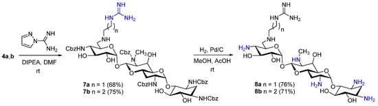 Guanidine groups are attractive for potentiating the activity of different classes, including AGs [31], as they have a positive charge at physiological pH, enabling stronger electrostatic and hydrogen-bonding interactions with nucleic acids. In addition, their incorporation can improve bacterial cell penetration and uptake of antibiotics into bacterial cells, enhance their aqueous solubility, and reduce susceptibility to AGEs, thereby strengthening antibacterial efficacy against resistant strains. Notably, streptomycin, one of the earliest AGs, contains a guanidine group, which contributes to its strong interactions with the bacterial ribosome and serves as a precedent for this design strategy. The alkylamino derivatives 4a,b were subsequently subjected to a guanidination reaction with 1H-pyrazole-1-carboximidamide, affording compounds 7a and 7b in good yields (Scheme 4). Further deprotection of the amino groups in 7a and 7b provided the target compounds 8a and 8b, isolated as the acetate salts in good yields.