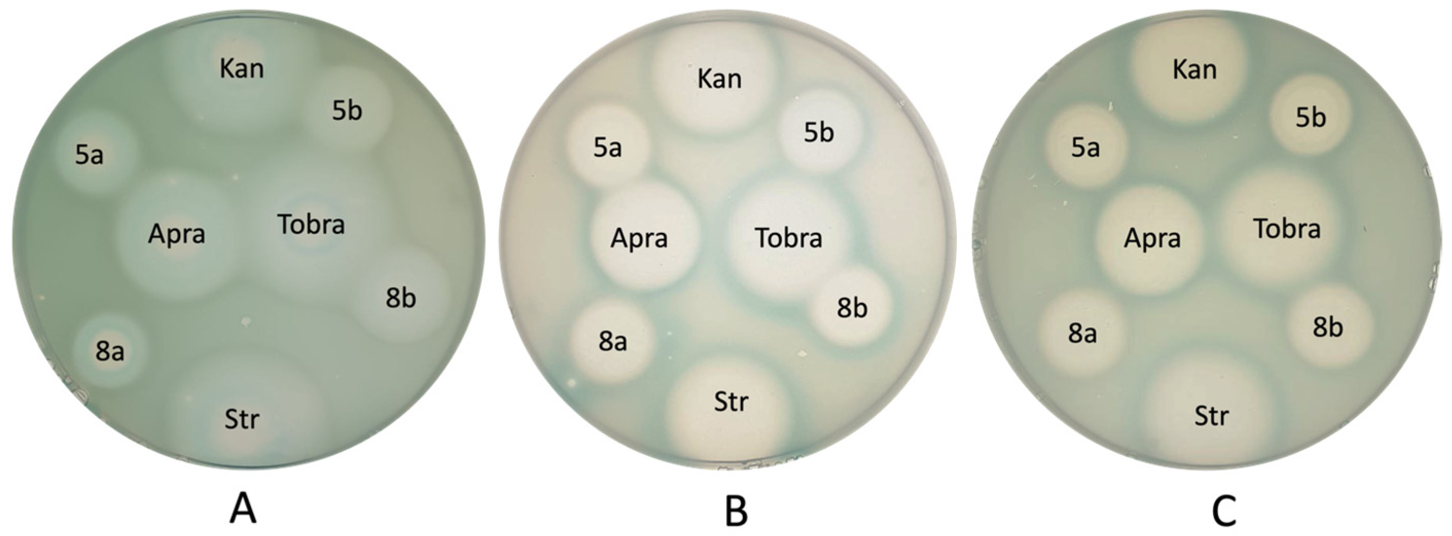 - Kang, A.D.; Smith, K.P.; Eliopoulos, G.M.; Berg, A.H.; McCoy, C.; Kirby, J.E. In vitro apramycin activity against multidrug-resistant Acinetobacter baumannii and Pseudomonas aeruginosa. Diagn. Microbiol. Infect. Dis. 2017, 88, 188–191. [Google Scholar] [CrossRef]