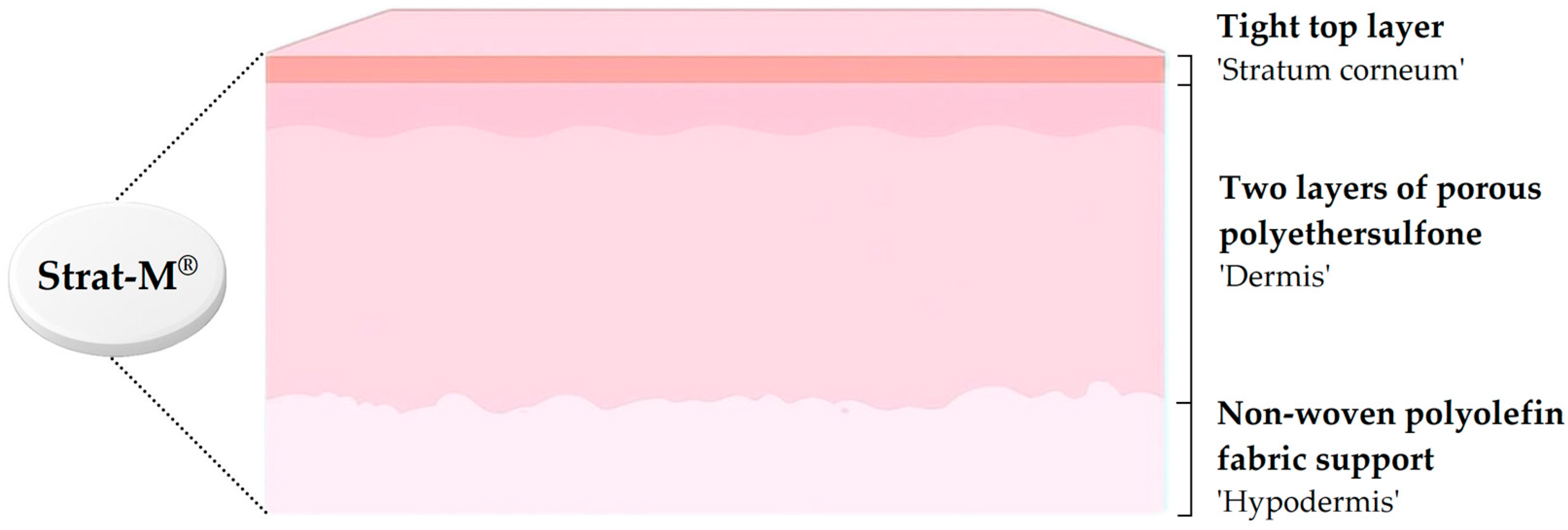 As summarized by Arce et al. [130], Strat-M® offers advantages in product optimization, regulatory compliance, and safety assessment. Structurally, the membrane mimics the multilayered organization and lipid chemistry of human skin [130]. Each Strat-M® membrane is approximately 300 µm thick, comprising a dense top layer treated with lipids and supported by two porous polyethersulfone layers resting on a non-woven polyolefin backing [129,131]. The upper layer emulates the SC, while the underlying layers replicate the epidermis and dermis [130]. The gradual increase in porosity and thickness across layers parallels the transition from epidermis to subcutaneous tissue [129], as illustrated in Figure 3. To further reproduce the hydrophobic characteristics of human skin, a proprietary lipid blend of ceramides, cholesterol, and free fatty acids is incorporated in ratios similar to those of human SC [129].