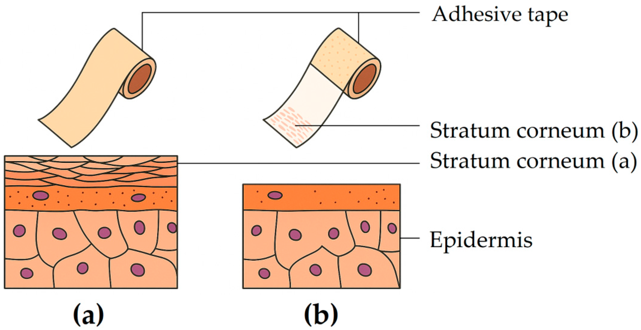 A complementary technique frequently used alongside permeation testing is tape stripping, which involves the sequential removal of SC layers with adhesive tape. The US FDA has explored this method for assessing the bioavailability and/or bioequivalence of dermally applied drug formulations [80,81]. The technique is based on three key assumptions: (i) the SC represents the main rate-limiting barrier to percutaneous drug absorption; (ii) drug concentration within the SC correlates with that in the viable epidermis; and (iii) SC drug levels are more predictive of dermatological efficacy than systemic plasma concentrations [82]. Short-term exposure studies can also provide valuable insights into partitioning and diffusion dynamics, enabling prediction of overall absorption profiles [80].