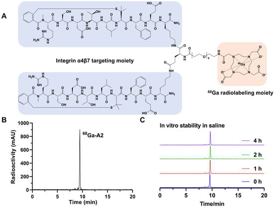 (A) Schematic structure of 68Ga-A2. Cyclic peptide targeting integrin α4β7 is marked with a blue shadow. The chelator for 68Ga radiolabeling is marked with an orange shadow. (B) Typical radio-HPLC chromatogram of 68Ga-A2. The radiolabeling yield of 68Ga-A2 was determined by radio-HPLC. (C) In vitro stability of 68Ga-A2 in saline for different times. The peak sizes were normalized with a consistent Y-axis range.