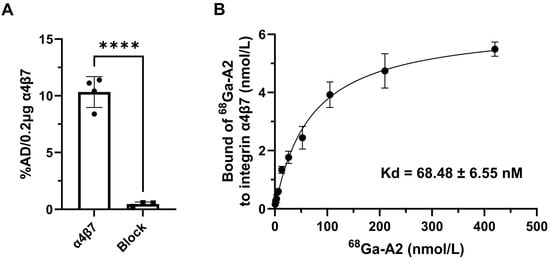 The binding specificity and affinity of 68Ga-A2 to human integrin α4β7 were determined by protein binding assay. 68Ga-A2 exhibited significant binding values (presented as %AD per 0.2 μg protein) for integrin α4β7 (10.33 ± 1.36). The specific binding was significantly inhibited by treating with excess unlabeled A2 peptide (0.46 ± 0.18, p < 0.0001) (Figure 2A). The dissociation constant Kd of 68Ga-A2 to integrin α4β7 was 68.48 ± 6.55 nM, which showed relatively high affinity among peptide-based radiopharmaceuticals.