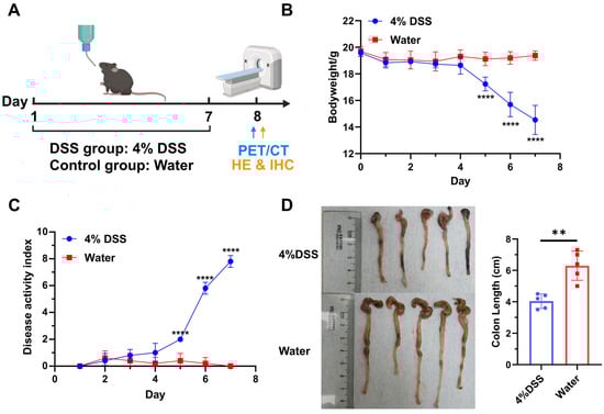 All animal experiments were performed in accordance with the guidelines of the Institutional Animal Care and Use Committee (IACUC) of Peking Union Medical College Hospital (approval number XHDW-2024-98, dated 24 June 2024). C57BL/6JNifdc mice (female, 6 weeks of age) were purchased from the Beijing Vital River Laboratory Animal Technology Co., Ltd. (Beijing, China) and were housed under a 12 h light/12 h dark cycle, with free access to food and water. On the basis of the published literature regarding DSS-induced colitis [21,22], and integrin α4β7-targeted imaging of IBD [23,24,25], C57BL/6JNifdc mice were treated with water containing 4% DSS (w/v) for 7 days (n = 20 totally) to establish the DSS-induced colitis model. For the control group, the mice were housed with normal water (n = 15 totally). The mice were weighed daily and assessed for clinical manifestations of colitis. The severity of the colitis was determined by a disease activity index (DAI) [26]: weight loss (0, none; 1, 1–4%; 2, 5–10%; 3, 11–20%; 4, >20%), fecal blood (0, none; 2, blood present in stool; 4, gross bleeding from the anus), and stool consistency (0, normal; 1, moist/sticky; 2, soft; 3, diarrhea; 4, bleeding). Ten mice (n = 5 of DSS-treated group and n = 5 of control group) were used for the validation and characterization of the model. On day 8, the mice were used for PET/CT imaging (n = 5 of DSS group and n = 5 of control group) and ex vivo biodistribution study (n = 7 of DSS group and n = 3 of control group). During the entire study period, if a mouse’s body weight decreases by more than 30%, the mouse would be considered to have reached a humane endpoint.