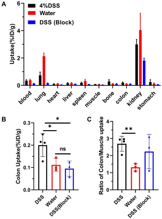 (A) Ex vivo biodistribution of various tissues and organs in control group (n = 3) and DSS groups (n = 4 for DSS group and n = 3 for blocking group) at 30 min post-injection. The mice in block group were co-injected with 68Ga-A2 and unlabeled A2 peptide. (B,C) Colon uptake and ratios of colon to muscle uptake were analyzed. ** means p value < 0.01, * means p value < 0.05.