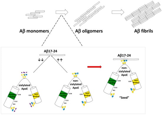 Data presented in this figure indicate that the sialic acid modification in human ApoE protein may serve as a key modulator of Aβ fibrillization. The removal of sialic acid increases ApoE binding affinity for Aβ17–24 residues and such an interaction may promote Aβ fibrillation. The presence of sialic acid attenuates ApoE binding with Aβ17–24 and reduces Aβ fibrillation [60].