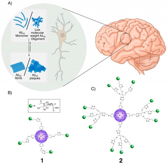 Sialic acid-functionalized glycodendrimers have been explored as light-activated therapeutic agents targeting Aβ42 fibrils in Alzheimer’s disease. First- and second-generation porphyrin-cored dendrimers carrying multiple sialic acid moieties were synthesized via copper(I)-catalyzed “click” chemistry. The peripheral sialic acid facilitated high-affinity binding to Aβ42 fibrils through the glycoside cluster effect, positioning the photoreactive porphyrin core in proximity to the fibrils. Upon irradiation, the porphyrin core generated singlet oxygen species, which disrupted hydrogen bonds and oxidized the peptide backbone, leading to the photolytic degradation of β-sheet-rich fibrils into lower-order soluble oligomers. High-resolution imaging, particle size analysis, and secondary structure studies confirmed the fragmentation of Aβ42 fibrils. Importantly, the glycodendrimers were non-toxic, even upon irradiation, and rescued SH-SY5Y neuroblastoma cells from Aβ42-induced cytotoxicity [76] (Figure 4).