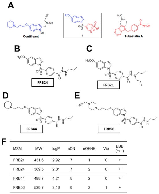 Novel FRB compounds inhibit target genes. (A) Schematic representation of the Contilisant (in blue) and Tubastatin A (in red) chemical structures. Schematic representation of the chemical structures of (B) FRB24, (C) FBR21, (D) FRB44 and (E) FRB56. (F) Table summarizing the physicochemical properties of the four MSMs and their predicted ability to cross the BBB.