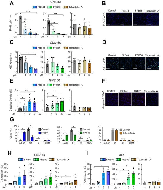 FRB44 and FRB56 are cytotoxic for patient-derived GSCs. (A,B) Quantification and representative pictures of p-H3-positive, (C,D) Ki67-positive and (E,F) cleaved caspase-3 cells after 1, 3 and 5 µM of FRB44, FRB56 and Tubastatin A treatments in GNS166 cells (n ≥ 3). Scale bar 200 μM; immunofluorescence images are included after 5 μM of treatment. (G) Cell cycle study in GNS166 cells after administration of 10 µM of FRB44, FRB56 and Tubastatin A (n ≥ 3). (H,I) β-galactosidase quantification of GNS166 and U87 cells treated with 1, 3 and 5 µM of FRB44, FRB56 and Tubastatin A. p ≤ 0.1 #, p ≤ 0.05 *, p ≤ 0.01 ** and p ≤ 0.001 ***.