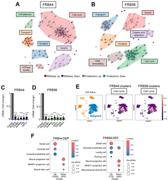 The cell cycle is a common biological theme after multiomic integration. (A) Clustering of top 25 up- and down-enriched pathways in a combined analysis of RNA-seq and proteomics for FRB44 and (B) FRB56. The width of the connecting bars is indicative of the number of genes that are shared between the two pathways. The full list of pathways is available in Figure S8A,B. (C) q-RT-PCR of selected DEGs from the cell cycle cluster in GNS166 non-treated and FRB44- and (D) FRB56-treated cells (n = 4). (E) Uniform Manifold Approximation and Projection (UMAP) visualization displaying the predefined cellular states from the original study, segmented into malignant cells and the tumor microenvironment (TME), and UMAP visualization of the GBMspace dataset depicting the mean module scores derived from the commonly differentially expressed genes (DEGs) within the cell cycle cluster defined by the FRB44 and FRB56 multiomic analyses. (F) Human cell type marker ORA from proteomic studies, based on data from the CellMarker database. p ≤ 0.001 ***.