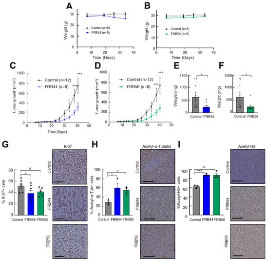 FRBs reduce tumor growth in vivo. (A) Weights of control and FRB44- and (B) FRB56-treated mice. (C) Measurements of tumor volume at indicated time points of mice treated intraperitoneally with vehicle (control) or 50 mg/kg of FRB44 and (D) FBR56 compounds. (E) Tumor weights at the final point of the experiment in control and FRB44- and (F) control and FRB56-treated animals. (G) Percents of Ki67-positive cells assessed by IHC in control and FRB44- and FRB56-treated animals. (H) Percents of acetylated α-tubulin-positive cells and (I) acetylated histone-3-positive cells assessed by IHC (n ≥ 3). The scale bar is 200 μM. p ≤ 0.1 #, p ≤ 0.05 *, p ≤ 0.01 ** and p ≤ 0.001 ***.